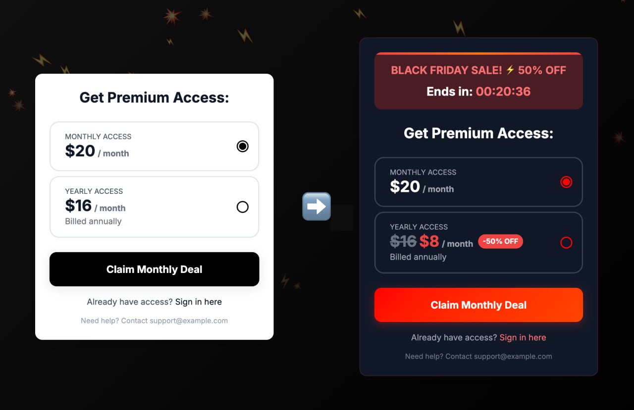 Например, под Черную пятницу билдер мог бы сам добавить стили в пейволл, как на скрине выше.
